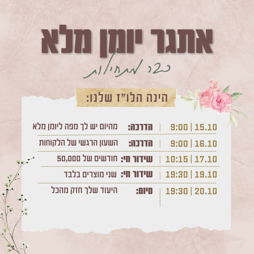 נפגשות לשידור החי בשישי ב10:15 + ראשון ה19.10 ב19:30! שריינו ביומן. חומר ממש חשוב יילמד שם.